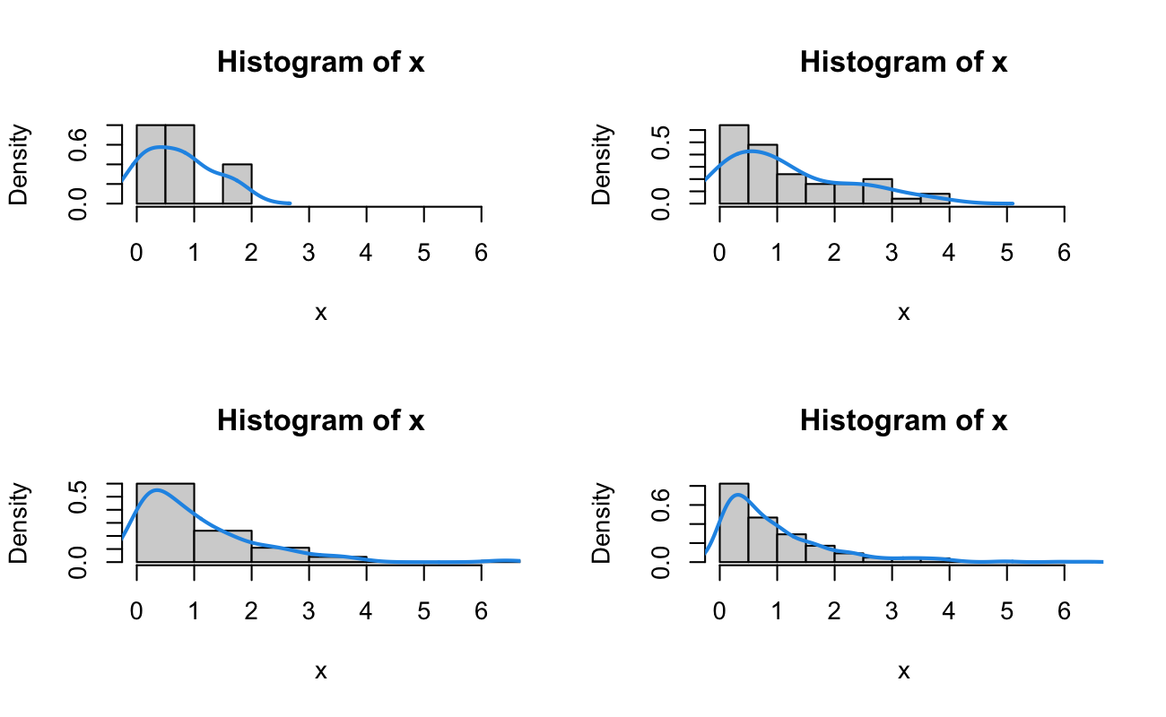 So, for these 7 independent trials where the waiting times \(T\) have an identical Exponential distribution with rate of 5 patients per hour, we wait 2.2, 0.3, 16.4, 0.1, 12.8, 12.5, 16.6 minutes to see the first patient.