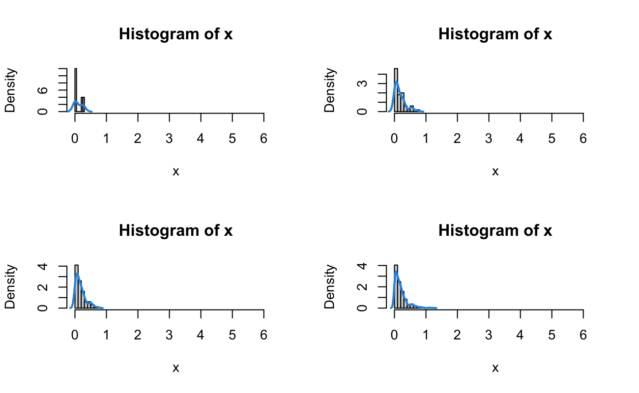 We then have that \(\bar{x} = \frac{1}{\lambda}\) and \(s^2 = \frac{1}{\lambda^2}\), which is an overdetermined system (with \(\hat{\lambda}_{\text{MoM}} = \frac{1}{\bar{t}}\)). For the Exponential Distribution, once we know the mean, then we should also know the variance. For our sample, generated from an Exponential with rate \(\lambda = 5\), \(\hat{\lambda}_{\text{MoM}}\) = 6.892. It’s worth noting that the Method of Moments estimate for this distribution requires a very large number of samples before it is “close” to the true value (the Maximum Likelihood estimator is the same, as we’ll see next).